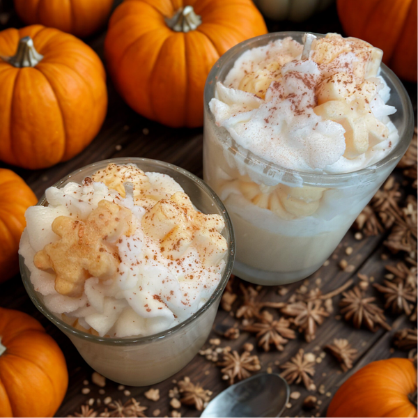Alsof je keuken zich vult met de geur van versgebakken koekjes en kruidige pompoen – dát is Pumpkin Gingerbread in een notendop. Deze bruine/oranje kaars is een feestje voor het oog én de neus. In het glas zie je vrolijke oranje pompoenen, de romige witte slagroomtoef bovenop maakt haar onweerstaanbaar, en de afwerking met mini-pompoentjes, gingerbread poppetjes en holografische glitter zorgt voor pure herfstmagie.